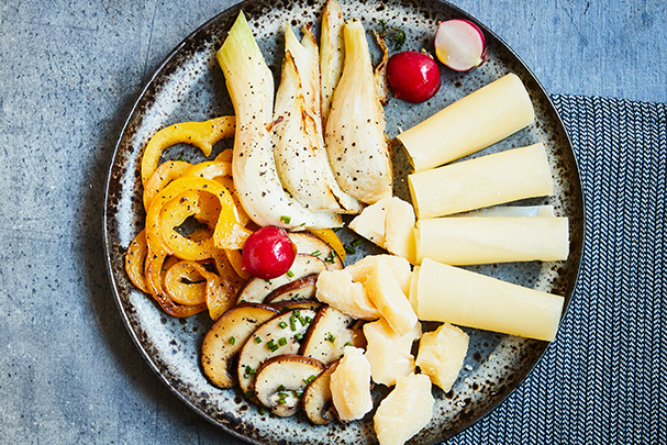 Disposer les rouleaux de Sbrinz AOP, les «Möcklis», les légumes marinés et les radis sur une grande assiette plate, puis servir.