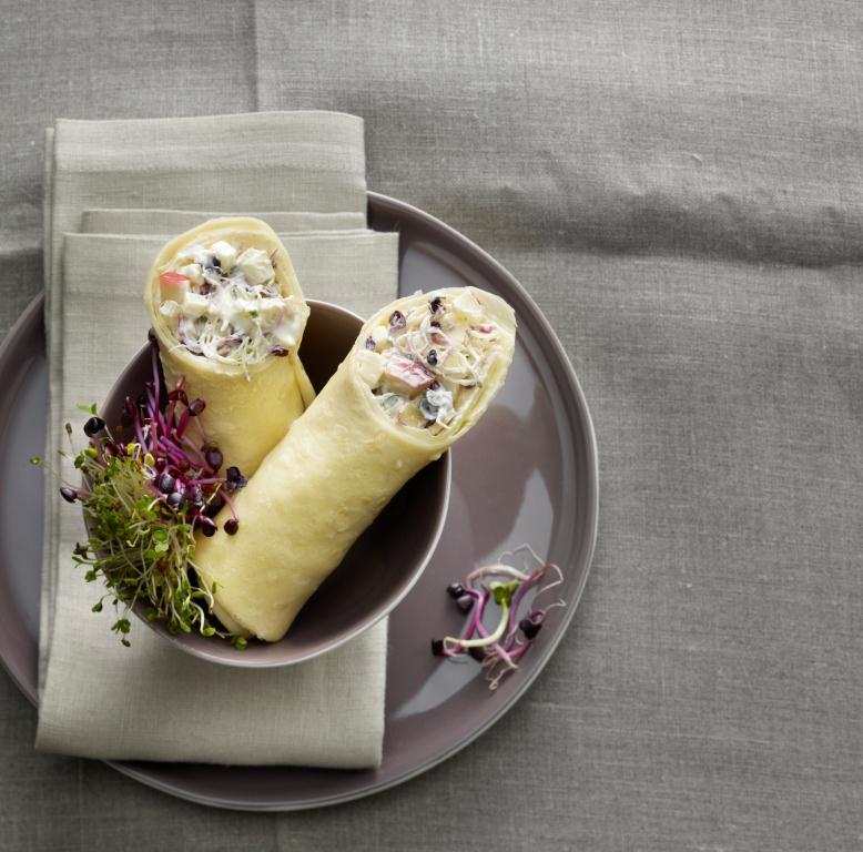 Répartir la farce sur les crêpes en laissant un bord de 2-3 cm. Rabattre le bord droit et gauche des crêpes d’environ 2 cm sur la farce, puis enrouler en commençant par le bas. Enduire le bord supérieur des crêpes d’un peu de fromage blanc (de la farce) et bien presser. Couper les crêpes en deux en diagonale.
