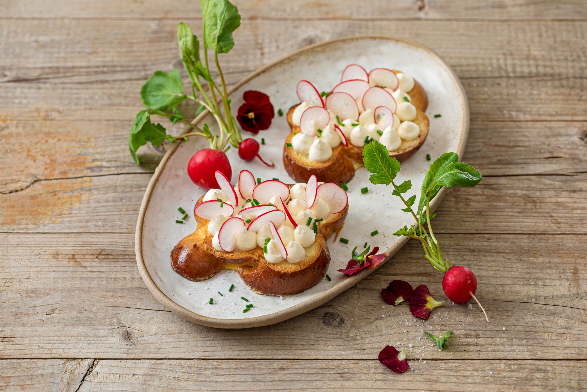Répartir le fromage frais, par petites touches, sur les tranches de tresse perdue. Y enfoncer des rondelles de radis, décorer et servir frais.