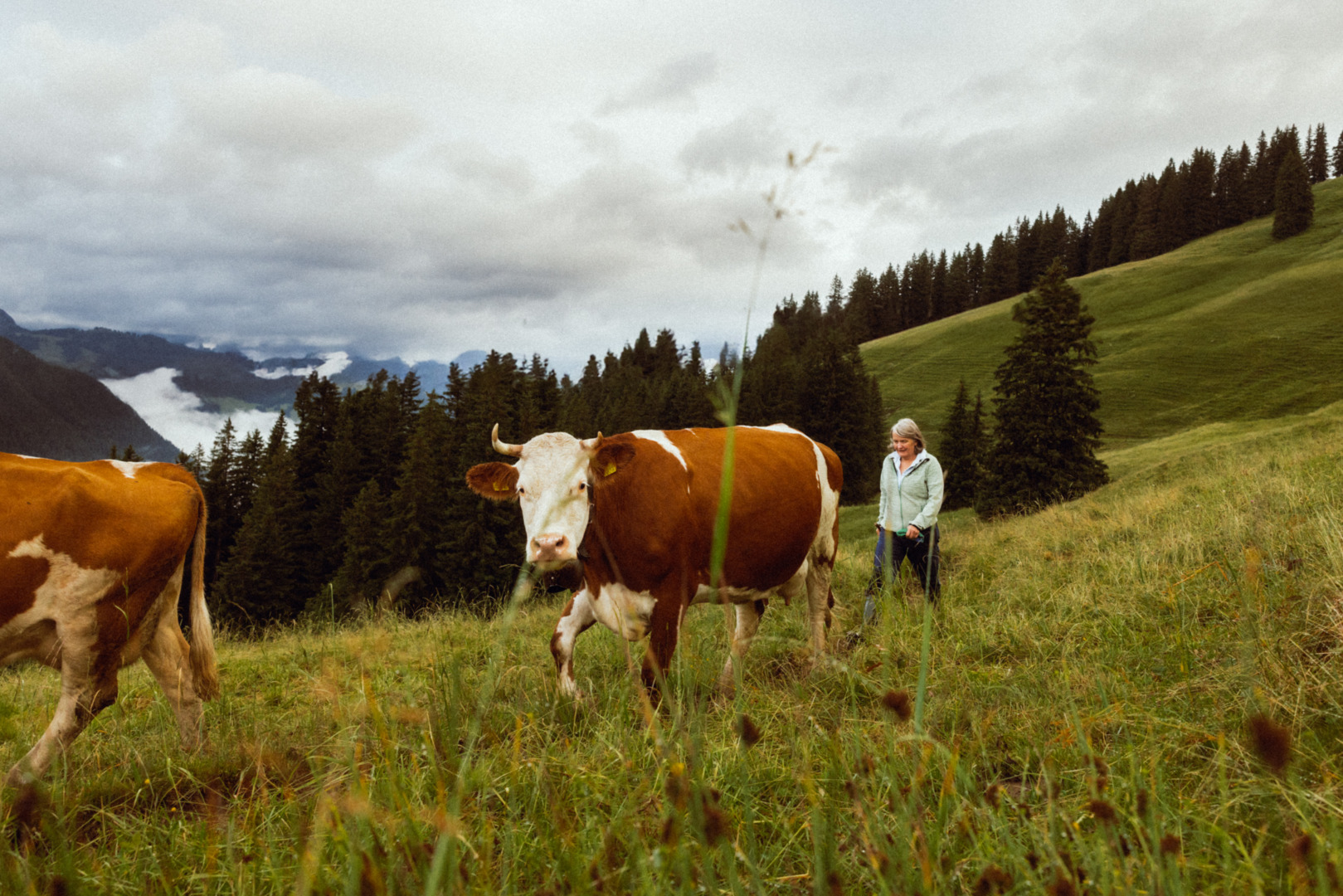Les Reichenbach sont une grande famille avec sept enfants et encore plus de petits-enfants. Dans le cadre de notre visite, nous faisons la connaissance des parents, Therese et Ernst. Dès son plus jeune âge, Therese se rendait chaque été au Satteleggbergli. C’est ainsi que, depuis presque 40 ans, elle passe ses étés à l’alpage avec son époux Ernst à ses côtés. Aujourd’hui, leur fils Marco et son épouse Jana, sans oublier la petite Elina, ont fait le déplacement de leur ferme dans la vallée pour être de la partie. Marco a pris la décision de reprendre la ferme et l’exploitation de l’alpage en compagnie de son épouse Jana.